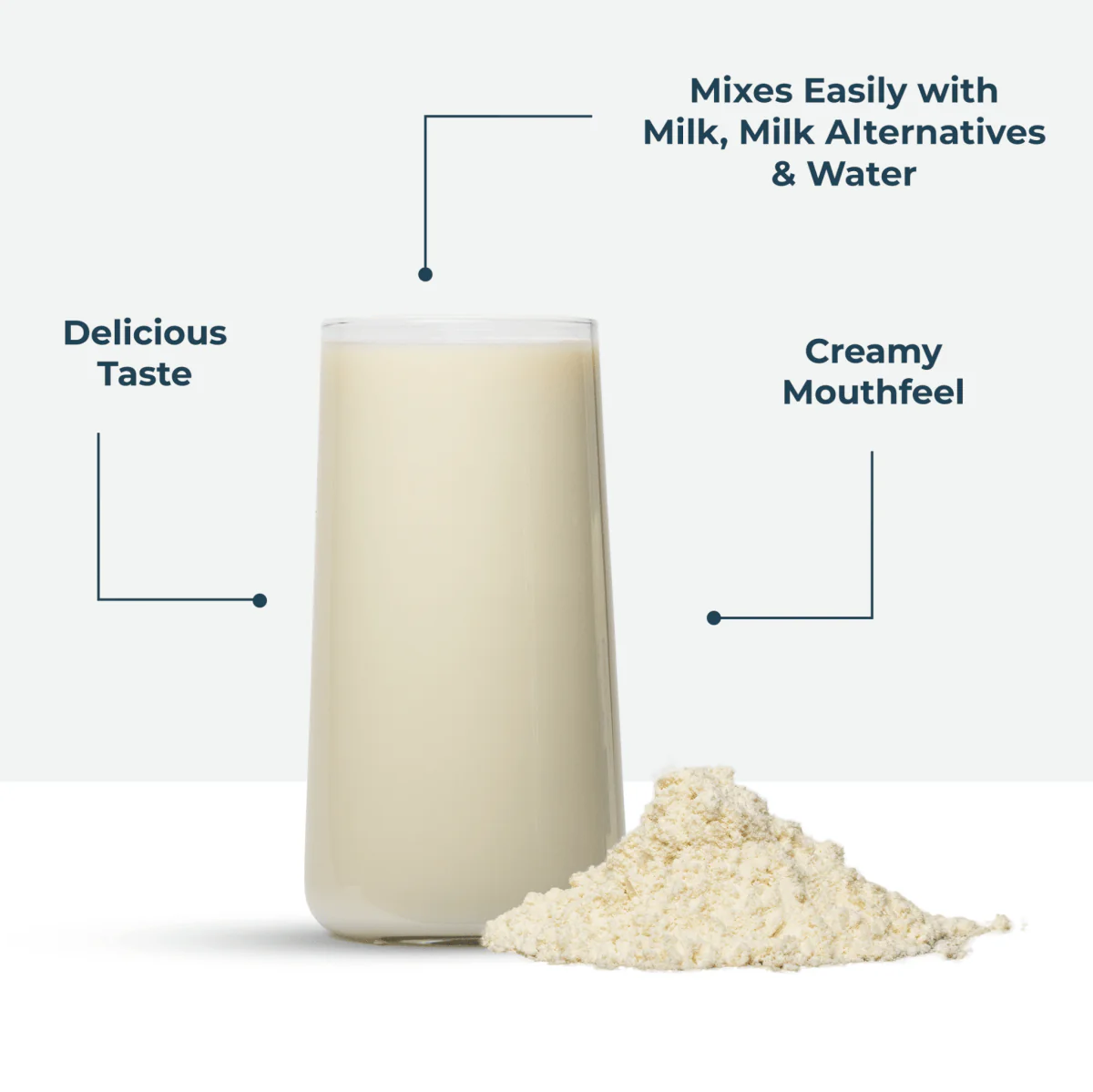 - It mixes easily with water, milk, milk alternatives and other ingredients